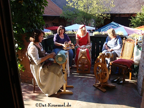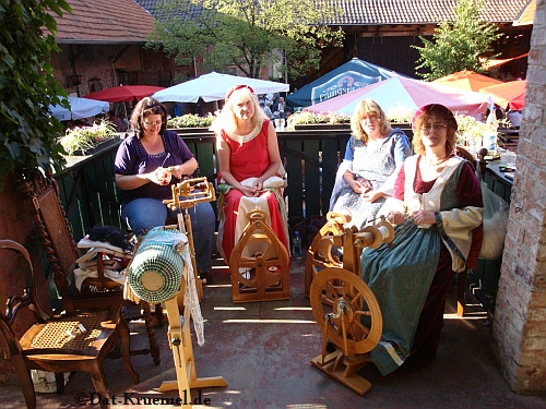 Am Samstag morgen trafen wir, Ramona, Evelyn und Gabi, uns um 9.30 Uhr zu einer kleinen Tasse Kaffee in Darmstadt, um uns dann gemeinschaftlich auf den Weg nach Groß-Umstadt zu machen. In Groß-Umstadt trafen wir dann Heidelore, Ulrike und Jörg, er hatte statt dem Spinnrad seine alte Sockenstrickmaschine dabei.