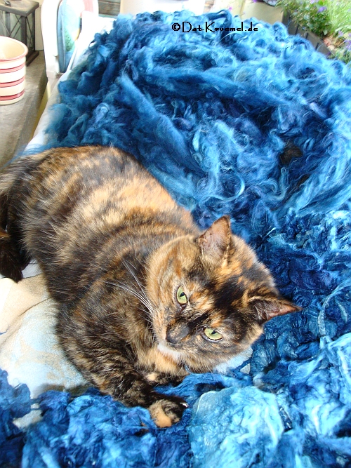 Ich sags ja, sie hat was vor. Nur ist Frauchen nicht so doof und lässt die Auftragswolle unbeaufsichtigt im Zimmer liegen, neee, tut sie nicht, liebes Hexchen!