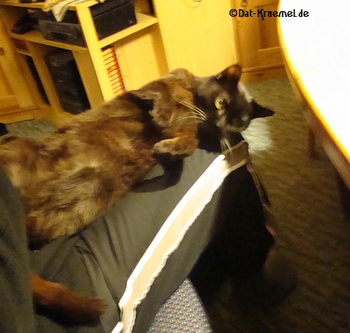 Ihren dusseligen Gesichtausdruck konnte ich heute allerdings nicht aufs Foto bahnen, ich war mit dem Bärchen beschäftigt. Der alte Herr hat sage und schreib 10 Minuten mit der Maus umeinander geschmust, wenn man mal von dem kurzen Tritt Ihr-wißt-schon-wohin, absieht. (Sorry, für die schlechte Bildqulität, aber einhändig fotografieren lässt nichts besseres zu. ).
