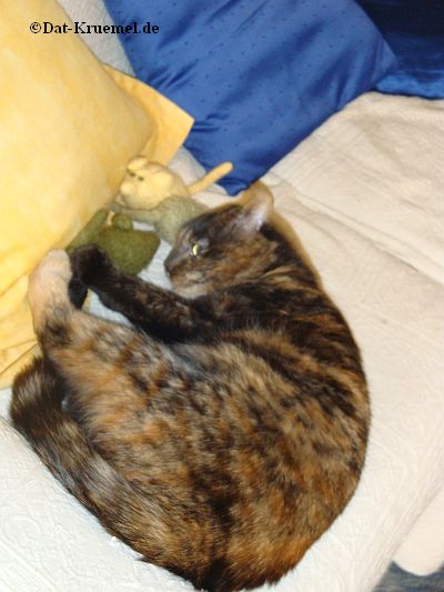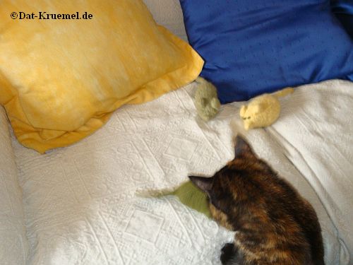Nur gut, dass der Kater nicht soooo zickig ist. Er schleicht sich jetzt immer wieder leise zu der seiner blauen Maus vom letzten Jahr... mitr der darf er jetzt ungestört schmusen.