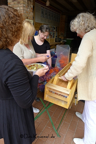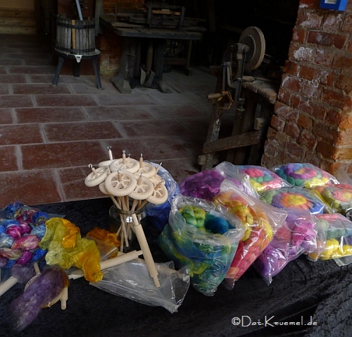 Wie sonst auch gab es wieder ein paar schöne bunte Zöpfe, die auf Wunsch auch den Besitzer gewechselt haben. Sabine hat ihre selbst gebauten Spindel dabei, die einfach super laufen.