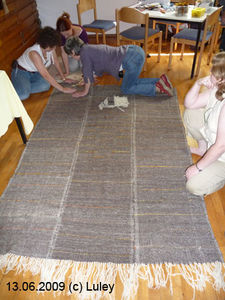 Auch meine, mit heißer Nadel fertiggestellte Decke, kam zum Finish-Einsatz an der Filzmaschine. Warum ist es immer so schlimm, wenn man an seinen eigenen Sachen etwas abschnippeln muss, aber halb so schlimm, wenns jemand anderes tut?