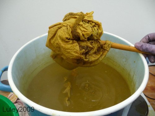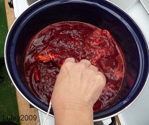 PS: Auch beim Pflanzenfärben ist es ratsam Handschuhe zu tragen...die ganze Zeit und nicht nur so lange, wie das Wasser heiß ist.