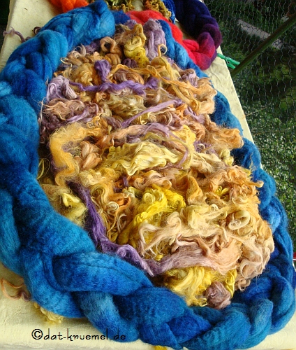 In der Mitte liegt die im Topf gefärbte Suri, gefärbt mit den Komplementärfarben Gelb-Lila. Ausserrum eine Spielerei in Blau mit Leicesterband. Witzig fand ich, dass nach dem Wässern die Kräuselung der Leicester zum Vorschein kam.
