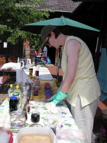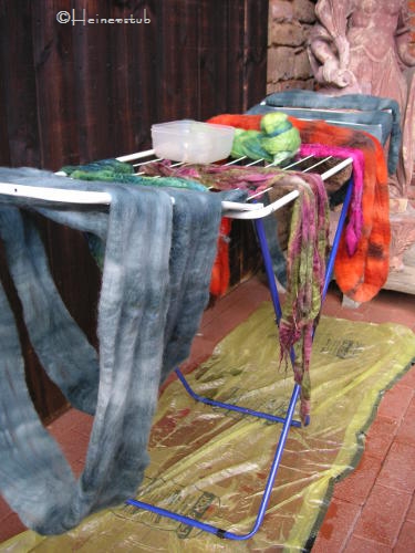 Während noch die letzten Stränge fixiert wurden, hat Corinna mal eben ein bissel Wolle kardieren wollen.