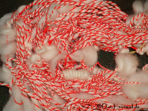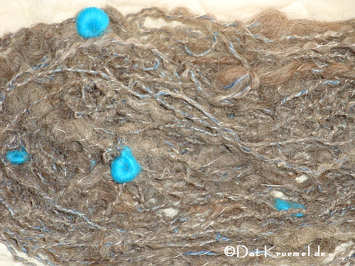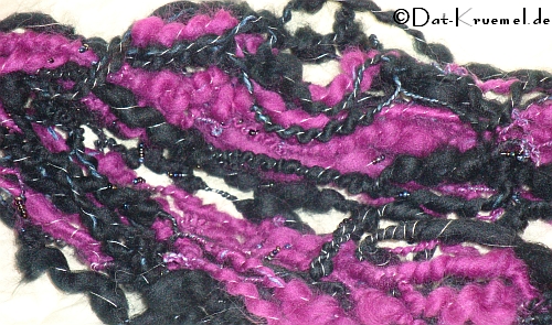 Dies ist ein Versuch gewesen, verfilzt und gefärbtes Vorgarn (Kaschmir-Seide; schwarz bis hellgrau) noch zu einem vernünftigen Material zu verarbeiten. Die kleinen KS-Teile sind beim Spinnen mit in den Merinofaden eingearbeitet worden und mit ganz dünner Seide gezwirnt.