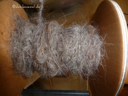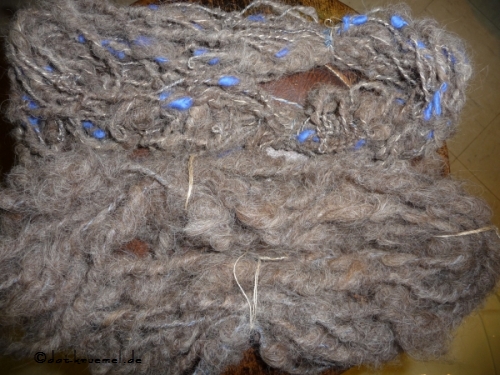 Zu erste habe ich Alpakafasern auf ein Industriegarn aufgesponnen und dann weiter verarbeitet: