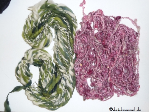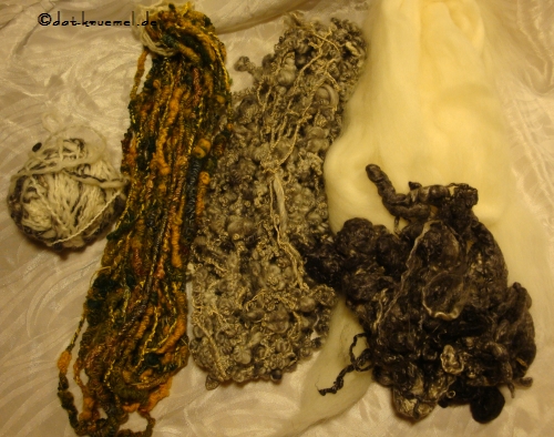 Die grün-gelbe Versionlinks ist vom letzten Kurs, das Knäuel auch. Rechts sieht man die "Zutaten" fürs Garn. Leider ist das Bild sehr gelbstichig....Raumlicht eignet sich halt nicht so zum fotografieren.Â