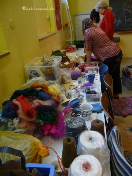 Gabriele schaffte es wieder mit Bravour die unterschiedlichen Wünsche unter einen Hut zu bekommen. Ein Teil der Gruppe startet mit Dick-dünn-Garn, die anderen versuchten sich an der Kardiermaschine um ein "eigens" Lacegarn zu mischen, die nächsten wollten ihre Boucle-Garn-Version vertiefen. So konnte jeder seiner Fähigkeiten und Wünsche nach das Garn seiner Vorstellungen machen. Einfach herrlich!