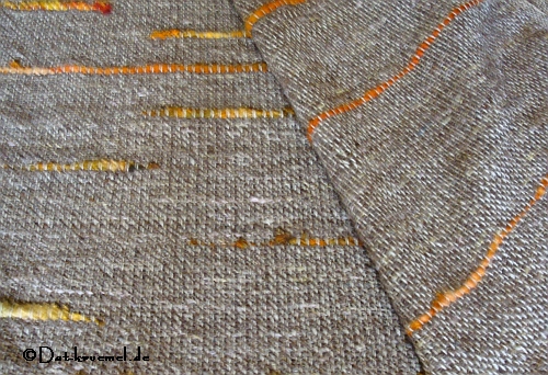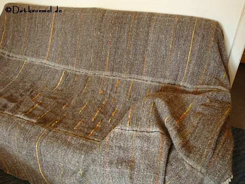 Unter sonstige Handarbeiten fiel auch das Zusammennähen meiner 2. Decke, die ich mit fliegenden Fahnen gewebt hab. Am Wochenende vorher purzelte der dritte Teil der Decke von der Harfe, jedes Teil ca. 73 cm breit. Eigentlich hatte ich ja evtl. vor noch einen 4 Streifen zu weben, da 2x 73 cm ein schöne Breit ergeben hätte. Aber irgendwas hielt mich davon ab. Nicht fragen was! Ich wußte es eh nicht.