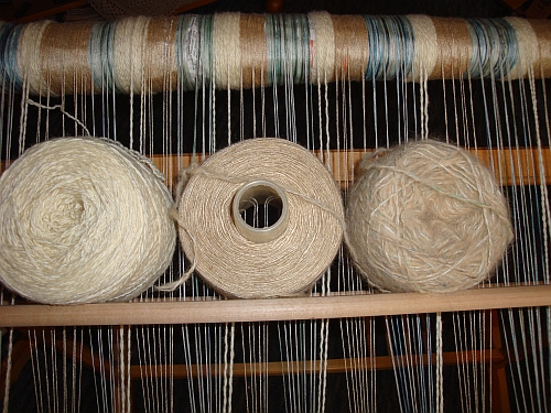 Ich hatte die Kette aus Tussah und Zwirngarnzu gleichen Teilen, je 6 Fäden, bereits fertig, zum Teil auch eingezogen, da kam mir die Idee mit der BFL.