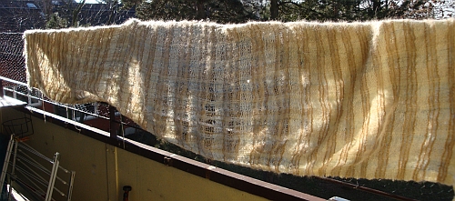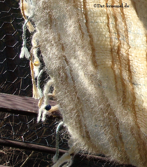 Um etwas kostbare Wolle zu sparen habe ich bei dem absoluten experimentellen Schultertuch nicht nur den absoluten Woll-Mix veranstaltet, sondern auch mit der Webdichte gespielt. Es ist in dem Mittelteil so locker und dünn, dass man das sogar um den Hals schlingen kann ohne sich zu erwürgen. Die beiden Ränder sind dichter.