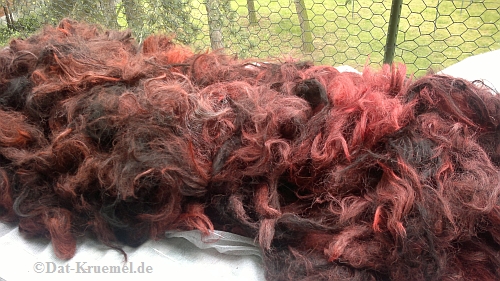 Langsam werden wir unvorsichtig, was die Alpakawolle und Farbe betrifft. Erst haben wir nur Seidenbobbel einkardiert, dann auch andere Farben zugesetzt, wie z.B. hier: