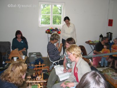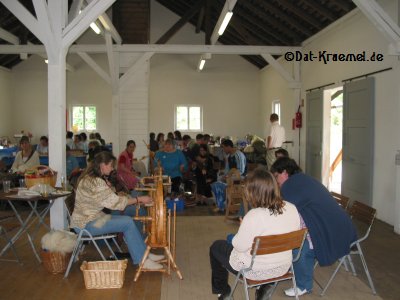 Es ist bestückt mit zwei Webstühlen, diversen Spinnrädern, mehreren langen
